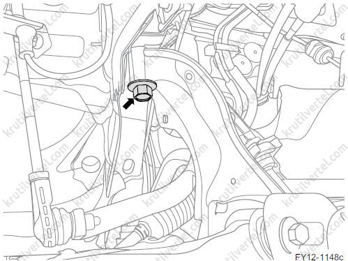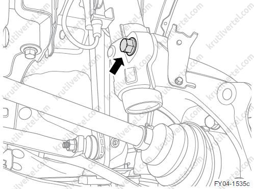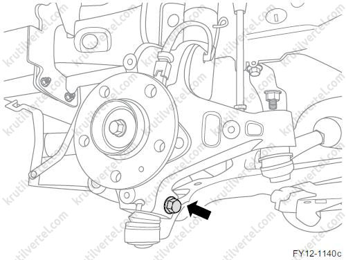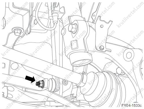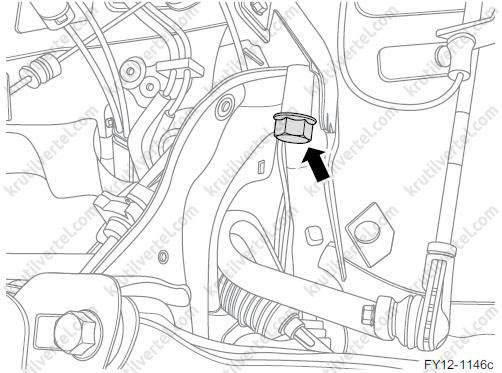 24. Викрутіть болт, що з'єднує передній кінець лівого нижнього важеля з підрамником.