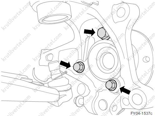 10. Викрутіть три болти, що з'єднують маточину переднього колеса з поворотним кулаком, і зніміть маточину.