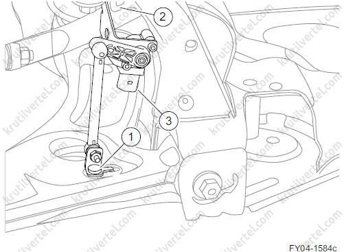 9. Від'єднайте роз'єм (3) джгута проводів переднього датчика висоти, відверніть гайку (1), що з'єднує передній датчик висоти з нижнім важелем.