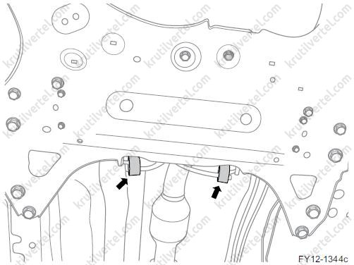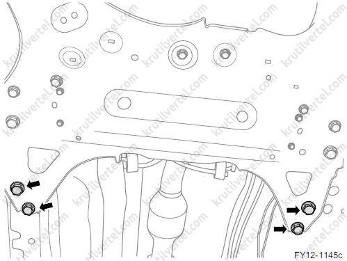 14. Викрутіть два з'єднувальних болта між переднім підрамником та правим кронштейном переднього теплозахисного екрана випускної труби.