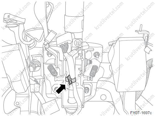 - Перед зняттям комбінованого перемикача та кермової колонки внутрішнє кільце спірального кабелю слід закріпити хомутом, щоб уникнути його повороту після зняття.
