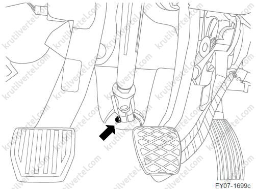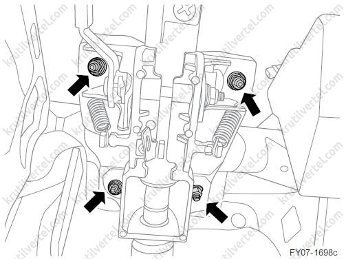 - Перевірте, чи не ослаблений болт головки рухомого з'єднання валу і кріпильний болт на монтажному кронштейні рульової колонки, а також переконайтеся у відсутності слідів зняття на мітках моменту затягування та поверхні гайки. У разі виявлення замініть або відремонтуйте відповідні компоненти.