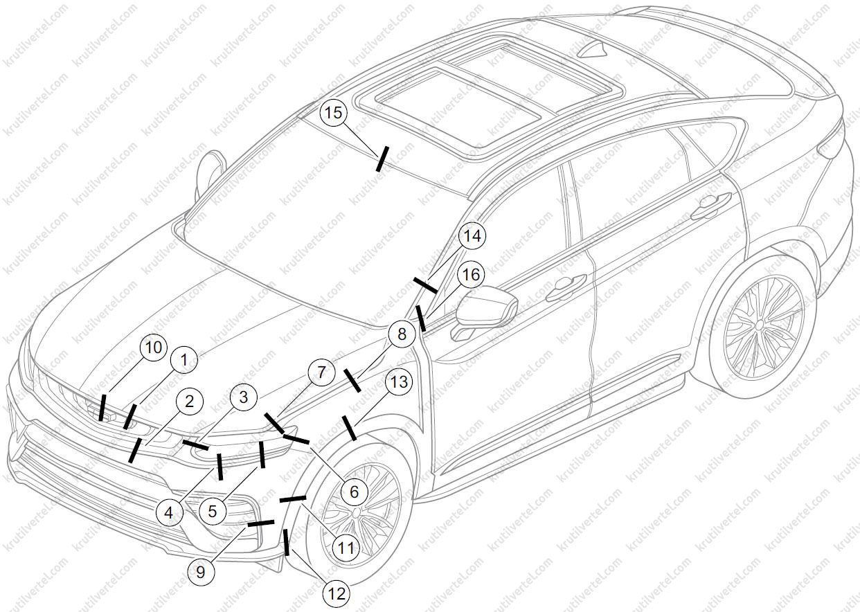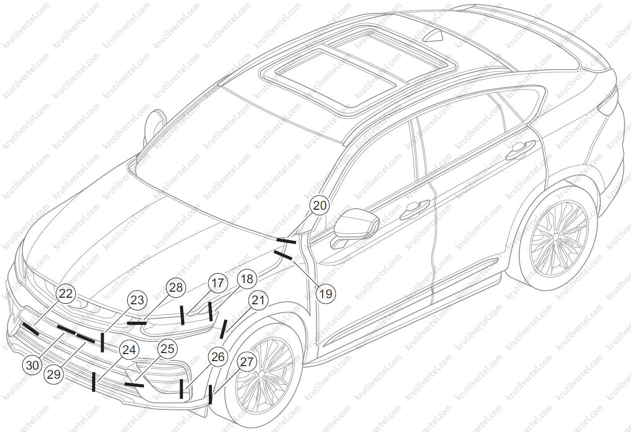 Кузовний ремонт, розміри та зазори кузовних панелей Geely Xingyue / Tugella з 2019 року випуску (+ рестайлінг 2022)
