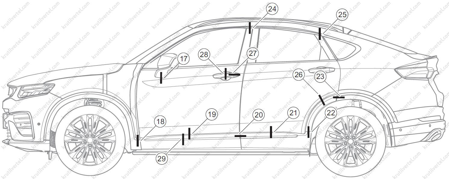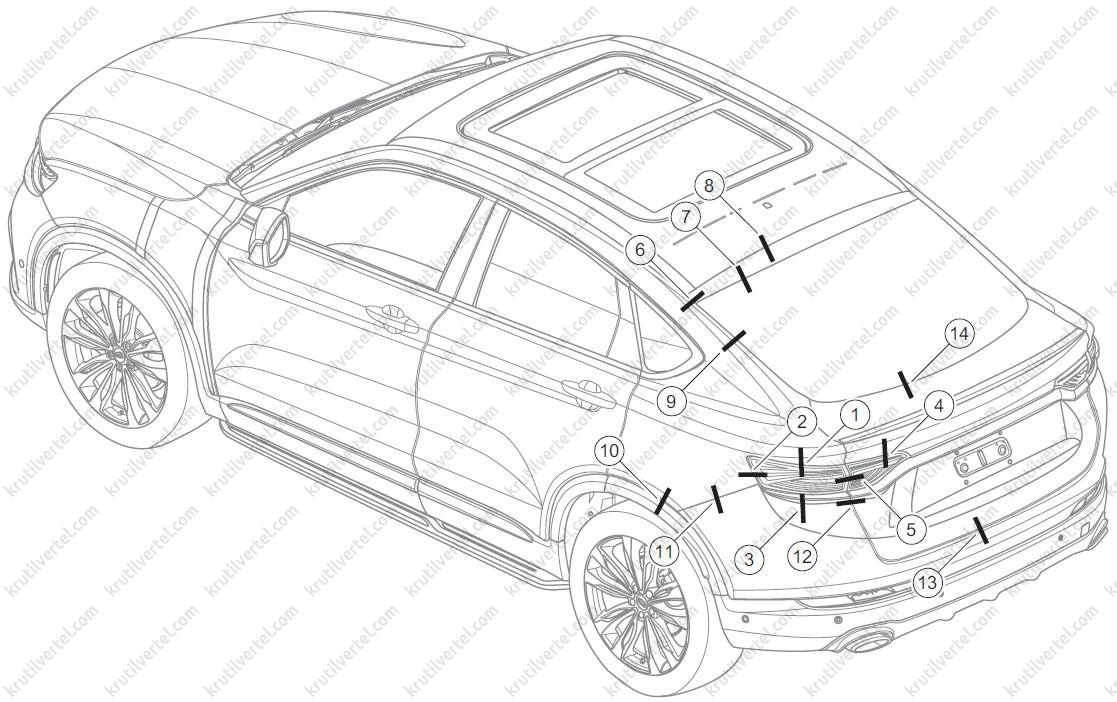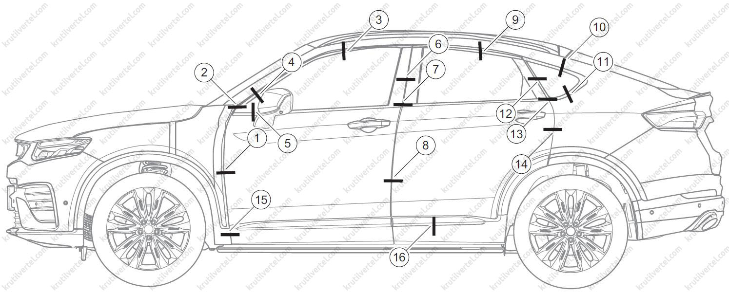 | 9 | Бічна стінка | Декоративна стрічка вікна задніх дверей | 6 ± 1,5 | -2,5±1,5 | 1,5 | / | / |