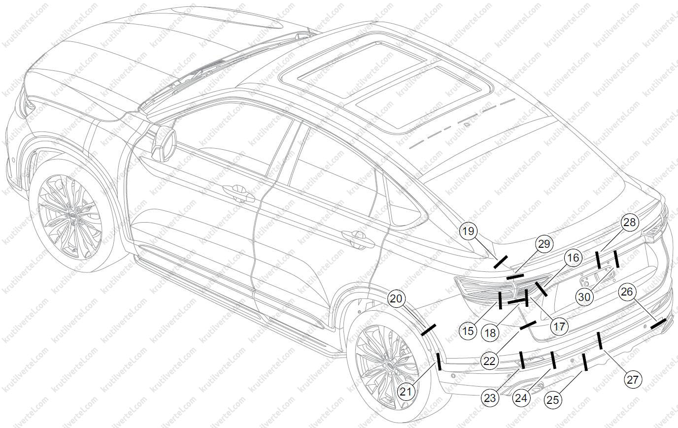 | 20 | Верхня частина заднього бампера | Облицювання задніх коліс | 0+0,5/0 | / | / | / | / |