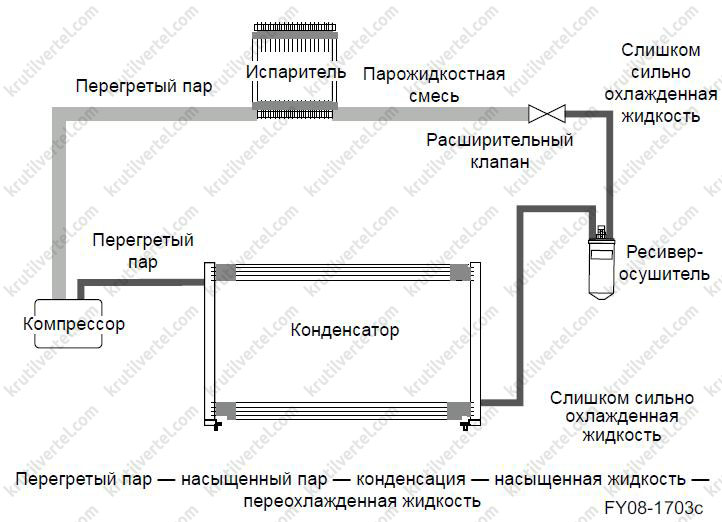 Пароподібний холодоагент високої температури і високого тиску з компресора кондиціонера надходить в конденсатор, що є системою з алюмінієвих трубок і ребер, що охолоджують, призначену для забезпечення швидкої тепловіддачі. Ребра, що охолоджують, допомагають конденсувати пароподібний холодоагент високої температури і високого тиску в рідину середньої температури і високого тиску шляхом розсіювання тепла.