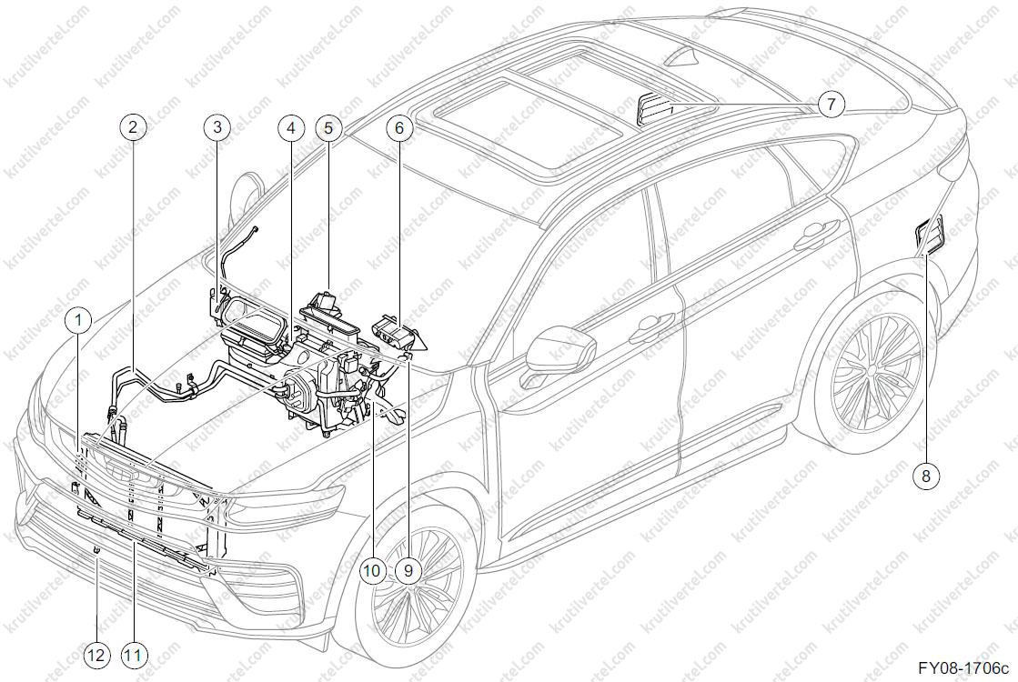 Опис, принцип дії та розташування компонентів системи кондиціонування Geely Xingyue / Tugella з 2019 року випуску (+ рестайлінг 2022)