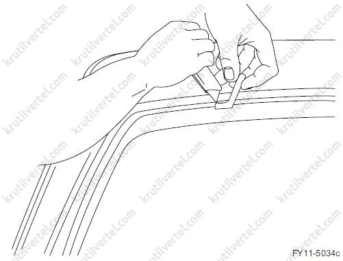 10. Працюючи в парі, зніміть герметик навколо лобового скла за допомогою тонкого сталевого дроту.