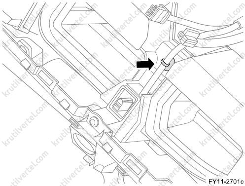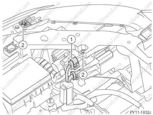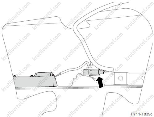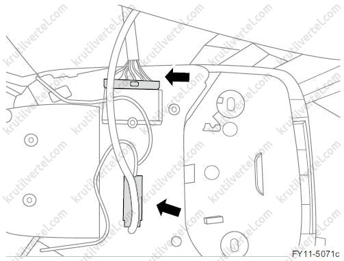 2. Зафіксуйте кріпильний затискач у центрі джгута проводів на правій декоративній накладці панелі приладів. Відрегулюйте положення джгута проводів плавно нагору і переконайтеся, що довжина джгута проводів між роз'ємом і затискачем така сама, як була до розбирання.