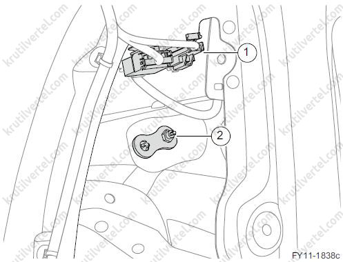 4. Від'єднайте роз'єм (1) джгута проводів декоративного підсвічування, натисніть і утримуйте пружину (2) і вийміть декоративне підсвічування з іншого боку внутрішньої захисної панелі дверей.