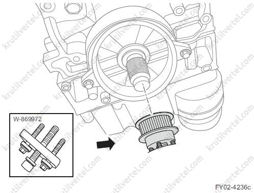 11. Викрутіть кріпильні болти із зубчастого шківа колінчастого валу та спресуйте шків за допомогою спеціального пристрою.