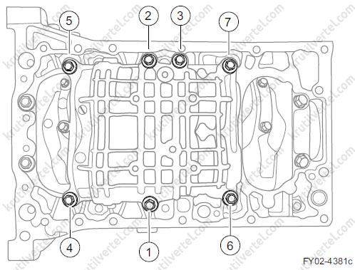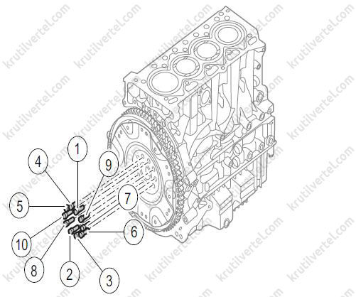 8. Поступово затягніть показані на малюнку десять болтів картера в два етапи в послідовності 3-8-9-2-4-7-10-1-5-6. Момент затягування: