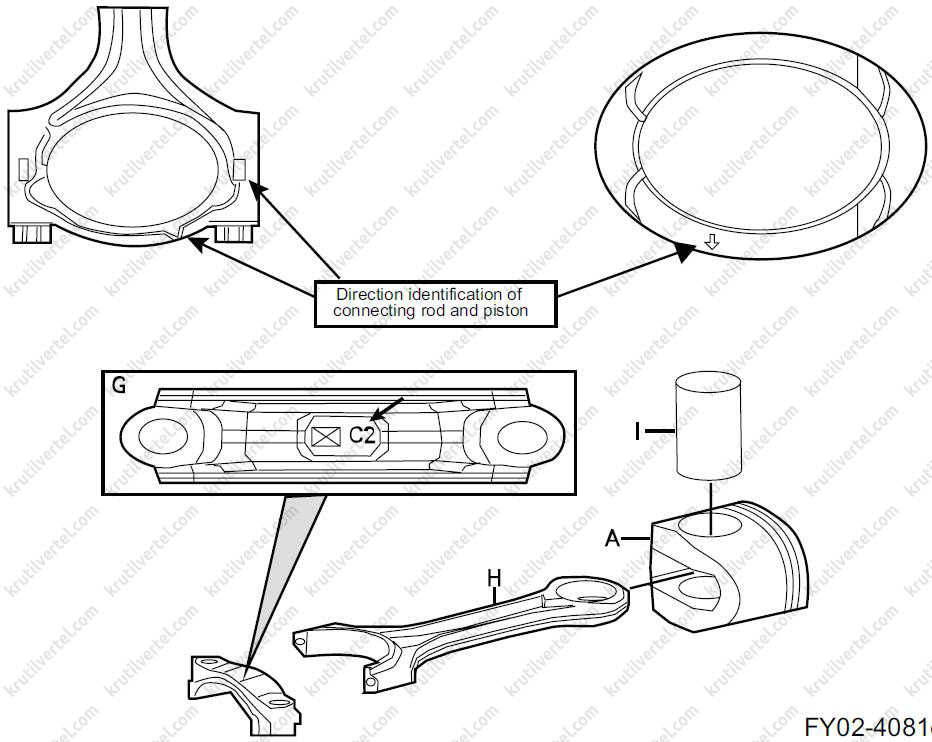 - Існує п'ять вагових груп шатуна (1-5); номер вагової групи вказано на нижній поверхні шатуна. Під час складання переконайтеся, що всі шатуни двигуна належать до однієї вагової групи (маркування вагової групи показано на вигляді G). Під час встановлення кришки шатуна переконайтеся, що мітки напрямку на стрижні шатуна та кришці збігаються та протилежні мітці напрямку поршня (напрямок стрілки). Переконайтеся, що поверхня кришки шатуна щільно поєднана з поверхнею стрижня шатуна без зазору.