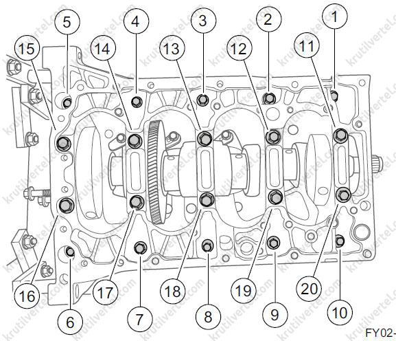 9. Поступово затягніть показані на малюнку десять болтів кришки корінних підшипників у чотири етапи в послідовності 13-18-19-12-14-17-20-11-15-16. Момент затягування: