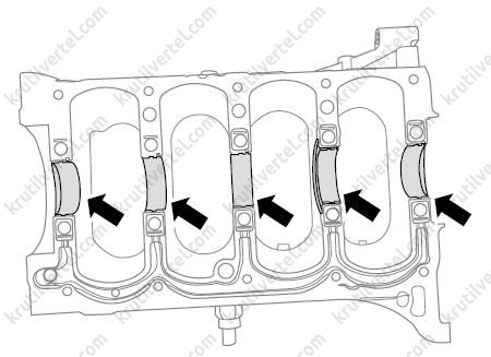 5. Встановіть вибрані нижні вкладки корінних підшипників на картер двигуна.