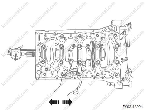 6. Переміщуючи колінчастий вал вперед і назад за допомогою викрутки, виміряйте величину осьового зазору за допомогою циферблатного індикатора. Номінальний осьовий зазор: 0,08 – 0,27 мм.