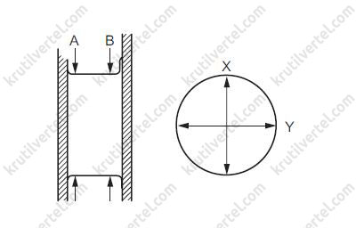 7. Виміряйте діаметр шийки у двох точках (А та В) у вертикальній та горизонтальній площинах (X та Y), як показано на малюнку. Якщо діаметр шийки колінчастого валу виходить за межі номінального діапазону, замініть колінчастий вал або відполіруйте шийку валу та встановіть підшипник меншого розміру: