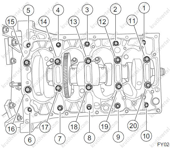 12. Поступово виверніть і зніміть показані на малюнку десять болтів картера двигуна в порядку 6-5-1-10-7-4-2-9-8-3. Потім рівномірно виверніть та зніміть показані на малюнку десять болтів кришки корінних підшипників у порядку 16-15-11-20-17-14-12-19-18-13.