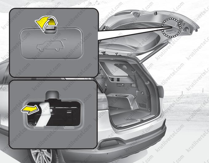 Автомобіль оснащений пристроєм аварійного відмикання дверей багажника, розташованим у нижній частині. Порядок відкриття дверей багажника при випадковому замиканні себе всередині багажника: