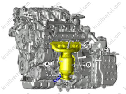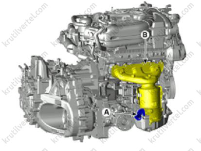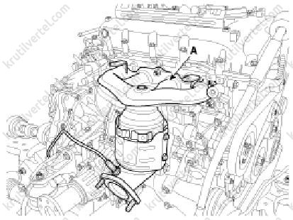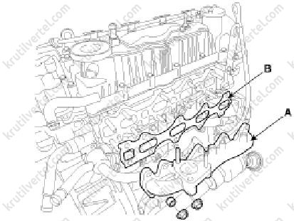 4. Зняти випускний колектор (А) із прокладкою (В).