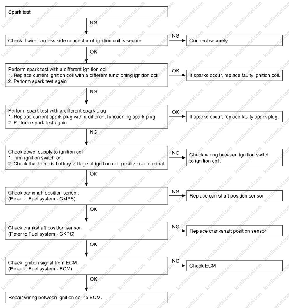 - Перевірити наявність іскри, обертаючи колінчастий вал двигуна стартером.