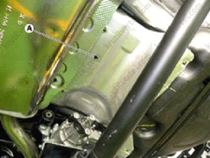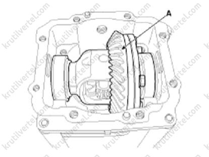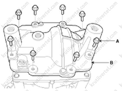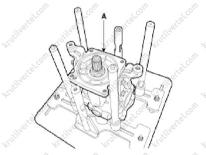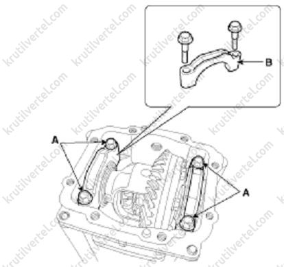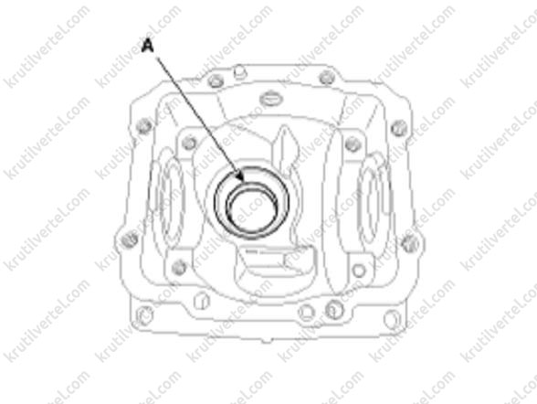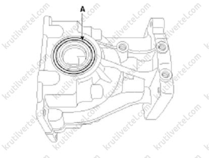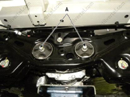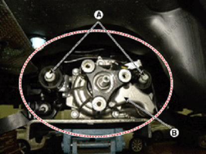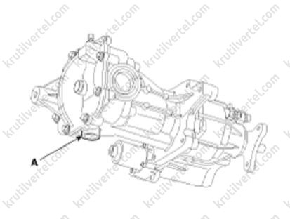 7. Підперти задню головну передачу домкратом і відвернути чотири болта кріплення (А). Домкратом опустити задню головну передачу в зборі з муфтою повного приводу.