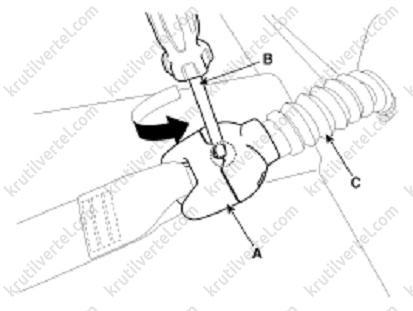 5. Щоб зняти стопорний механізм (А) з пристрою аварійної фіксації (С), повернути його за годинниковою стрілкою плоскою викруткою (В).