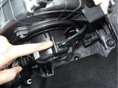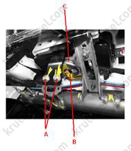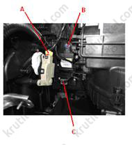 - Від'єднати роз'єм приводу температурної заслінки (А), кластерного іонізатора (В) та резистора (С).