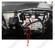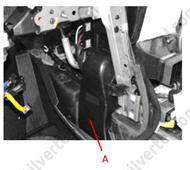 16. Від'єднати головні колодки (А) стельового джгута проводів та звільнити монтажні затискачі електропроводки на передніх кузовних стійках.