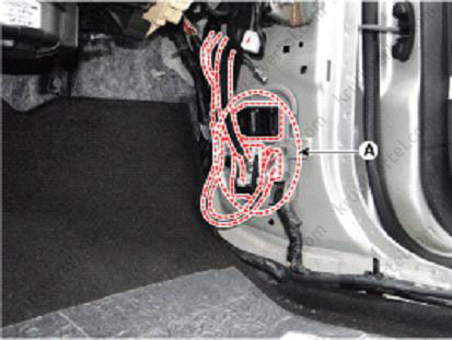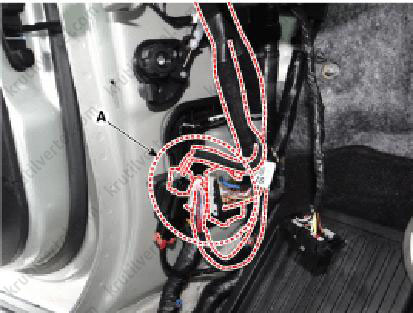 9. Від'єднати головні колодки (А) стельового джгута проводів та звільнити монтажні затискачі електропроводки на передніх кузовних стійках.