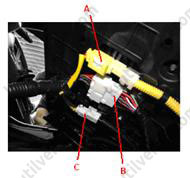 2. Від'єднати роз'єм бічної подушки безпеки (А), роз'єм підігріву та електроприводу сидіння (В) та роз'єм датчика ременя безпеки (С).