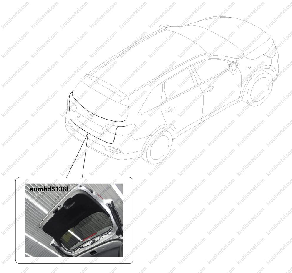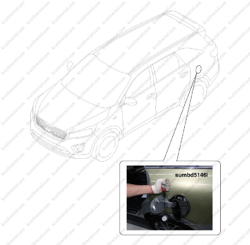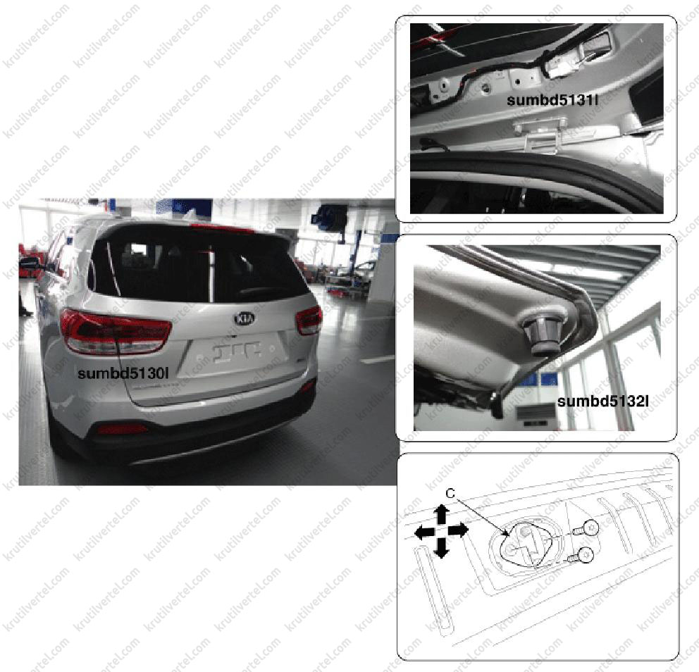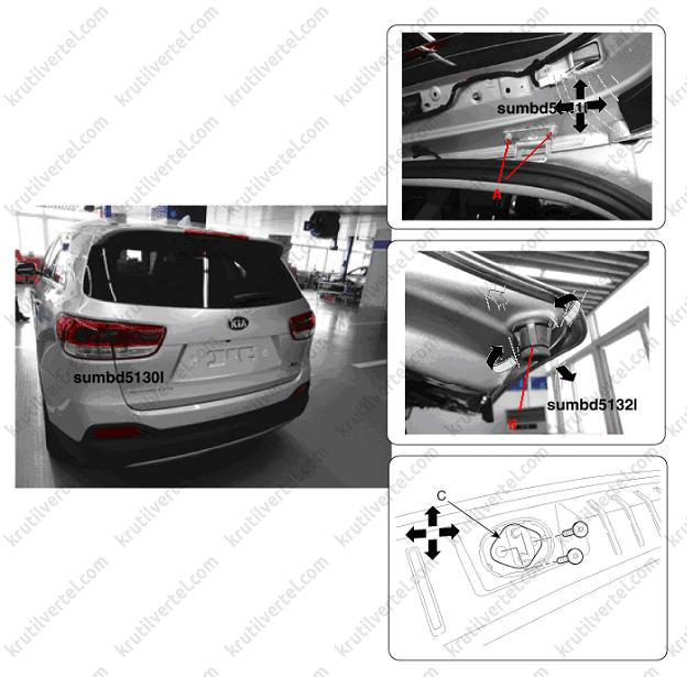 ![Послабити болти кріплення навісів (А), після чого відрегулювати положення дверей багажника, переміщуючи її вгору або вниз, вправо або вліво екстер'єр KIA Sorento Prime з 2018 року, екстер'єр Кіа Соренто Прайм з 2018 року]()