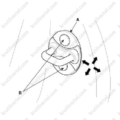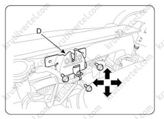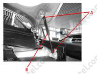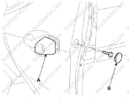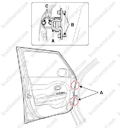 - Послабити болти (В) кріплення навісів до дверей, після чого перемістити двері всередину або назовні до збігу панелі з поверхнею кузова.