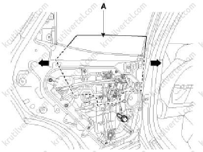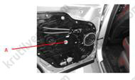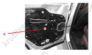 8. Відкрутити гвинти кріплення (А) і злегка зрушити напрямну скло задніх дверей у напрямку стрілки на ілюстрації.