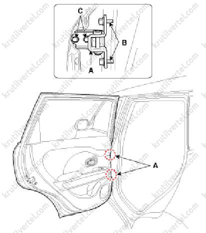 - Послабити болти (С) кріплення навісів до кузова, після чого перемістити двері вперед або назад, вгору або вниз, до вирівнювання зазорів.