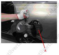 9. Видалити заглушку монтажного отвору скла задніх дверей (А).