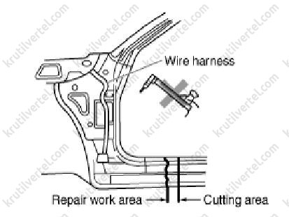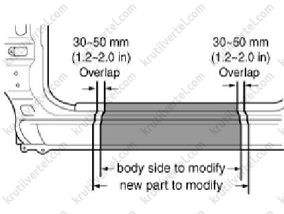 Вибрати найбільш доступну область для обрізки, яка найменше схильна до деформування при зварюванні. Обробити область таким чином, щоб вона забезпечувала накладання нової частини з нахлестом 30 – 50 мм.