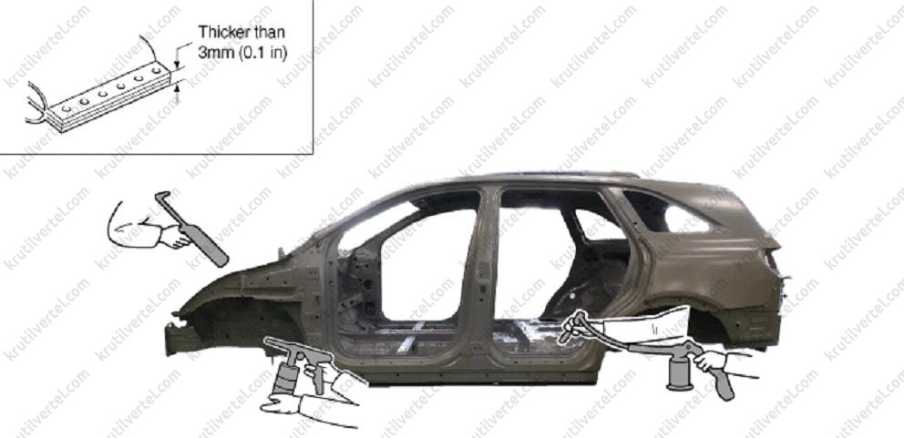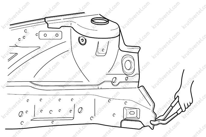 Дотримуватись обережності при знятті молдингів та облицювання з оброблюваної поверхні кузова. Нанести клейку стрічку на ділянки, де необхідно запобігти пошкодженню частини або кузова автомобіля, що видаляється. Перед проведенням робіт перевірити наявність трубопроводів, шлангів або електропроводки поблизу пошкодженої ділянки.