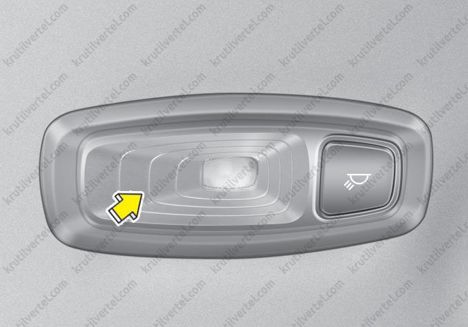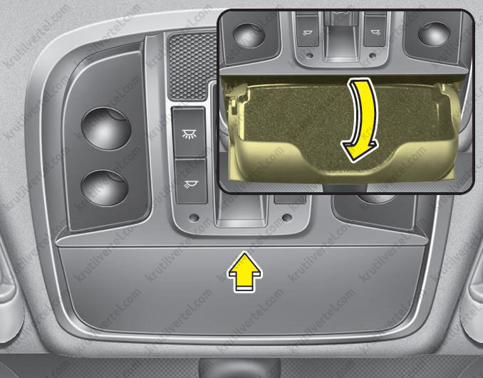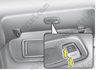 Щоб відкрити відділення для сонцезахисних окулярів, натисніть на кришку, і воно повільно відкриється. Покладіть сонцезахисні окуляри в дверцята відділення так, щоб їх скла були звернені назовні. Натисніть на кришку, щоб закрити.