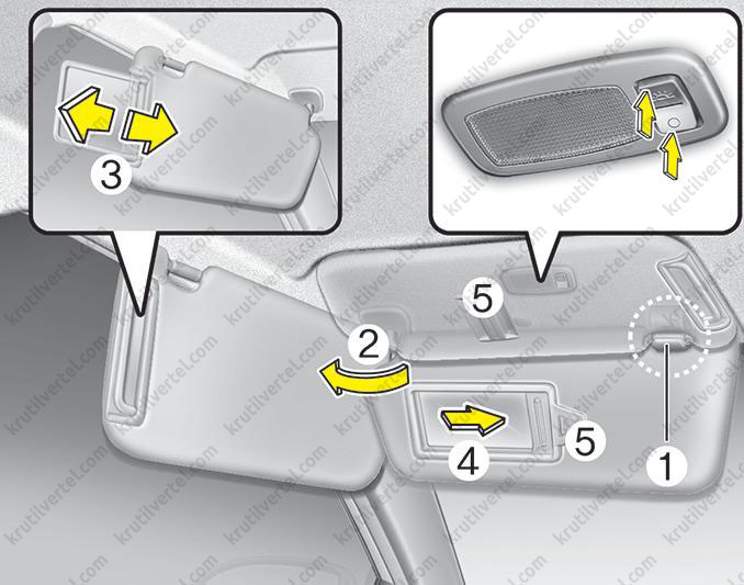 Якщо використовується лампа дзеркала, її необхідно вимкнути перед поверненням сонцезахисного козирка у вихідне положення. Якщо лампу не вимкнути, це може призвести до розрядження акумуляторної батареї та пошкодження сонцезахисного козирка.