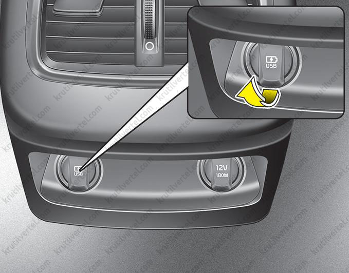 Зарядний пристрій USB призначений для заряджання акумуляторів різних гаджетів через USB-кабель. Заряджання електричних пристроїв можна виконувати, коли кнопка запуску/зупинки двигуна знаходиться в положенні «ACC»/«ON»/«START».
