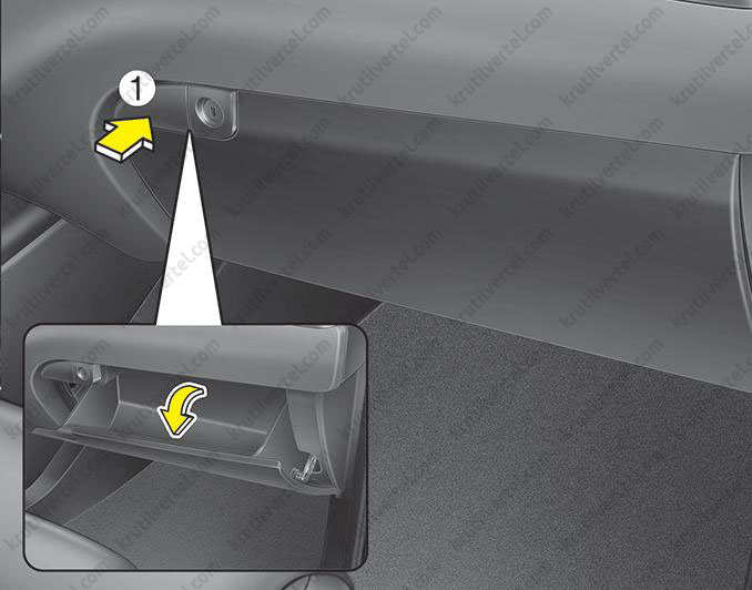 Для закриття та відкриття ящика рукавички натисніть основну кнопку. Щоб відкрити ящик рукавички, натисніть кнопку(1), і ящик рукавички відкриється автоматично. Після використання закрийте ящик рукавички.