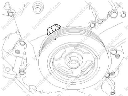 - Повернути шків колінчастого валу на один оборот за годинниковою стрілкою (360°) до суміщення канавки на ньому з настановною міткою «Т» на кришці приводного ланцюга.