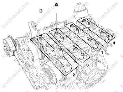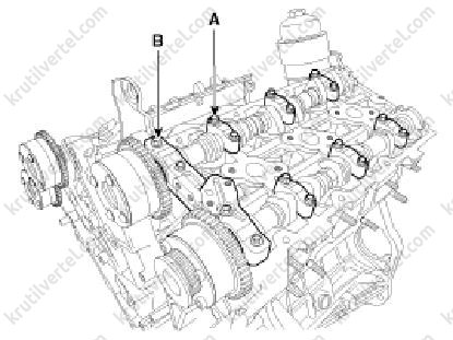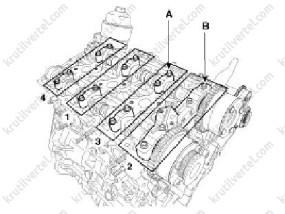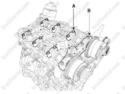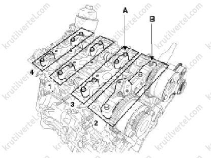 - Зняти кришки підшипників лівого/правого розподільних валів (А) та кришку завзятих підшипників (В).