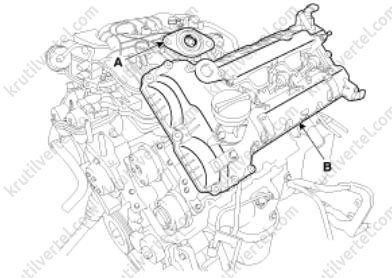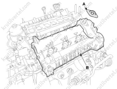 - Зняти кришку лівої головки блоку циліндрів (В) із прокладкою.