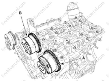 - Зняти клапан подачі оливи на фазообертачі лівого/правого випускних розподільчих валів (А).