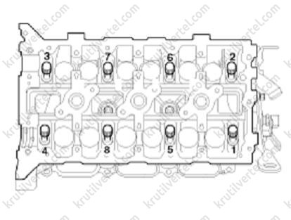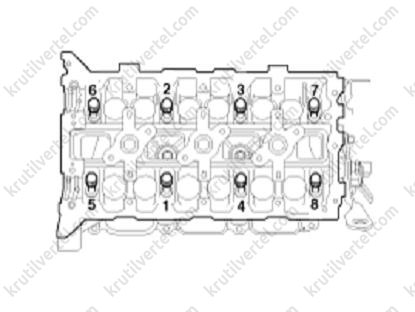 - Затягнути болти головки блоку циліндрів за кілька підходів моментом 37.3 ~ 41.2 Н в порядку, зазначеному на малюнку, а потім додатково дотягнути спочатку на кут 118 ~ 122°, а потім ще 88 ~ 92° за допомогою спеціального пристосування.