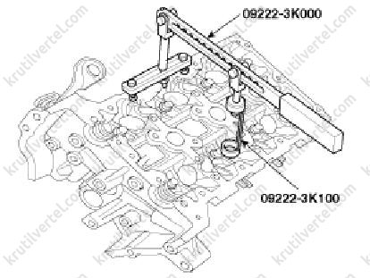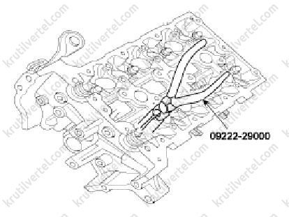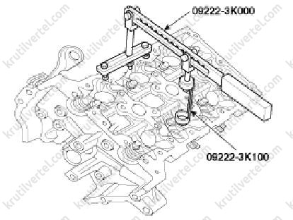 3. Використовуючи спеціальний пристрій (09222-3K000, 09222-3K100), стиснути пружину клапана та встановити сухарі. Перш ніж звільняти пружину, перевірити правильність встановлення сухарів, натискаючи на важіль пристрою два-три рази.