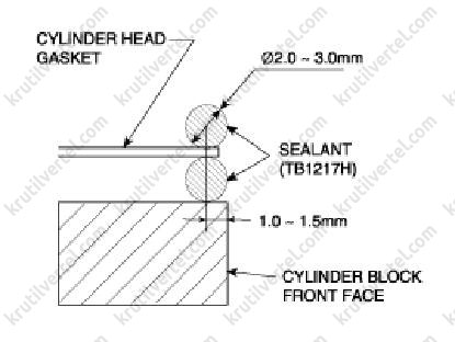 - Нанести герметик (THREEBOND 1217H або еквівалентний) на верхню поверхню блоку циліндрів перед встановленням прокладки, як показано на малюнку.