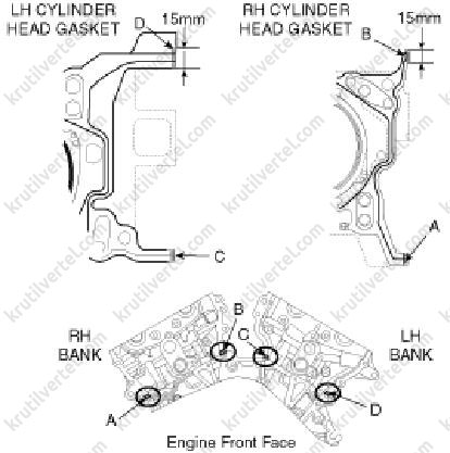 - Нанести герметик на прокладку головки блоку циліндрів після її встановлення на блок циліндрів, як показано на малюнку.